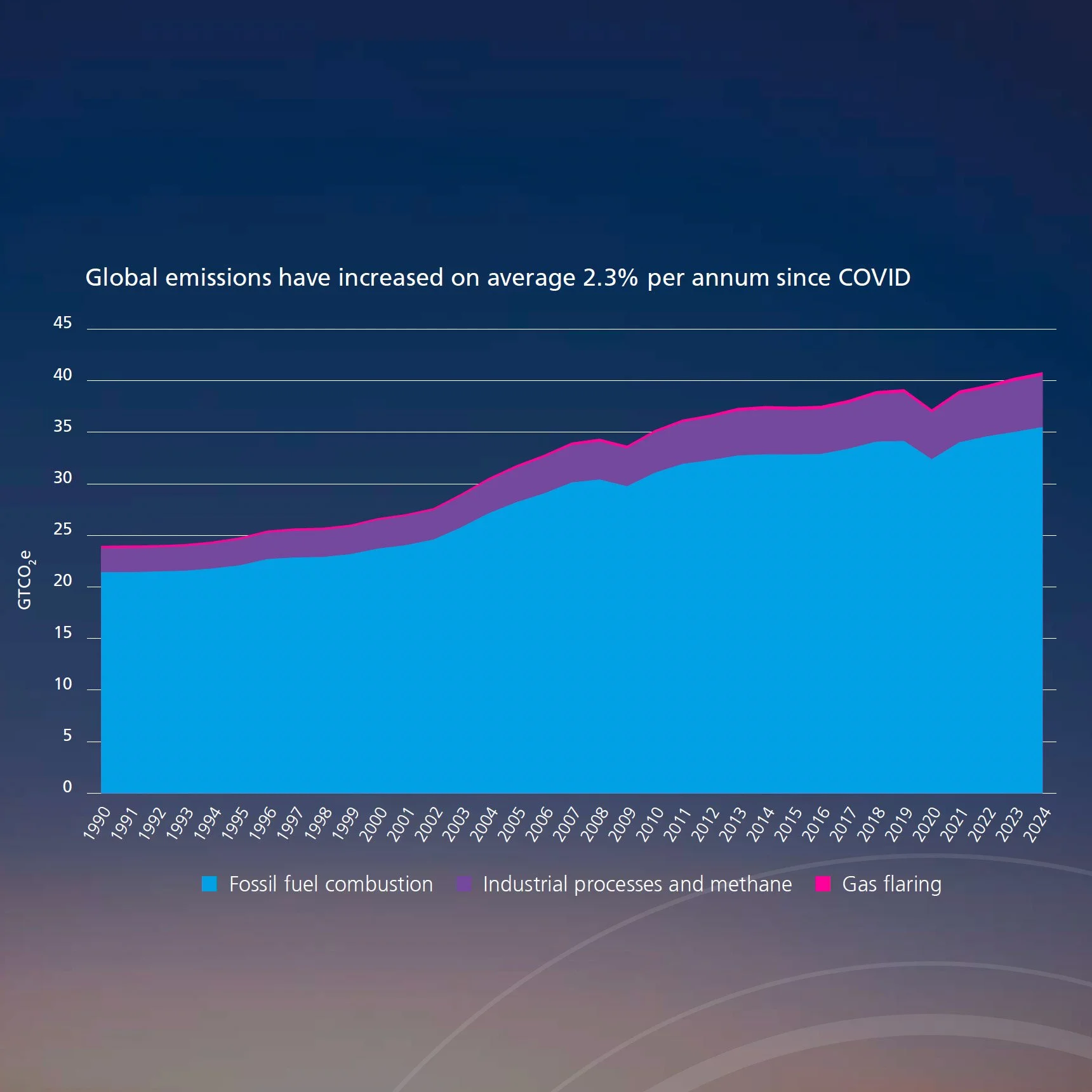 Four graphs that tell you everything you need to know about the dire situation the world is still in, roller-coastering towards, and surely through, 1.5 degrees and then onto 2 degrees and so on. Four graphs, courtesy of the immensely detailed 2025 Energy Institute Statistical Review of World Energy, in partnership with KPMG and Kearney, which tell the story in dozens of pages of data of energy demand and supply in 2024. Last year, on almost exactly the same day, I wrote that the 2024 edition (covering 2023 data) was one of the most depressing reports I had ever read. (cf. ‘A Review of World Energy, 28 June 2024). This one, sadly, is no better, despite a heroic attempt at trying to make us feel better by telling us how much fossil fuel use has been avoided by the rising supply of renewables and nuclear energy. But what really matters is set out in these four graphs I have lifted from the report.